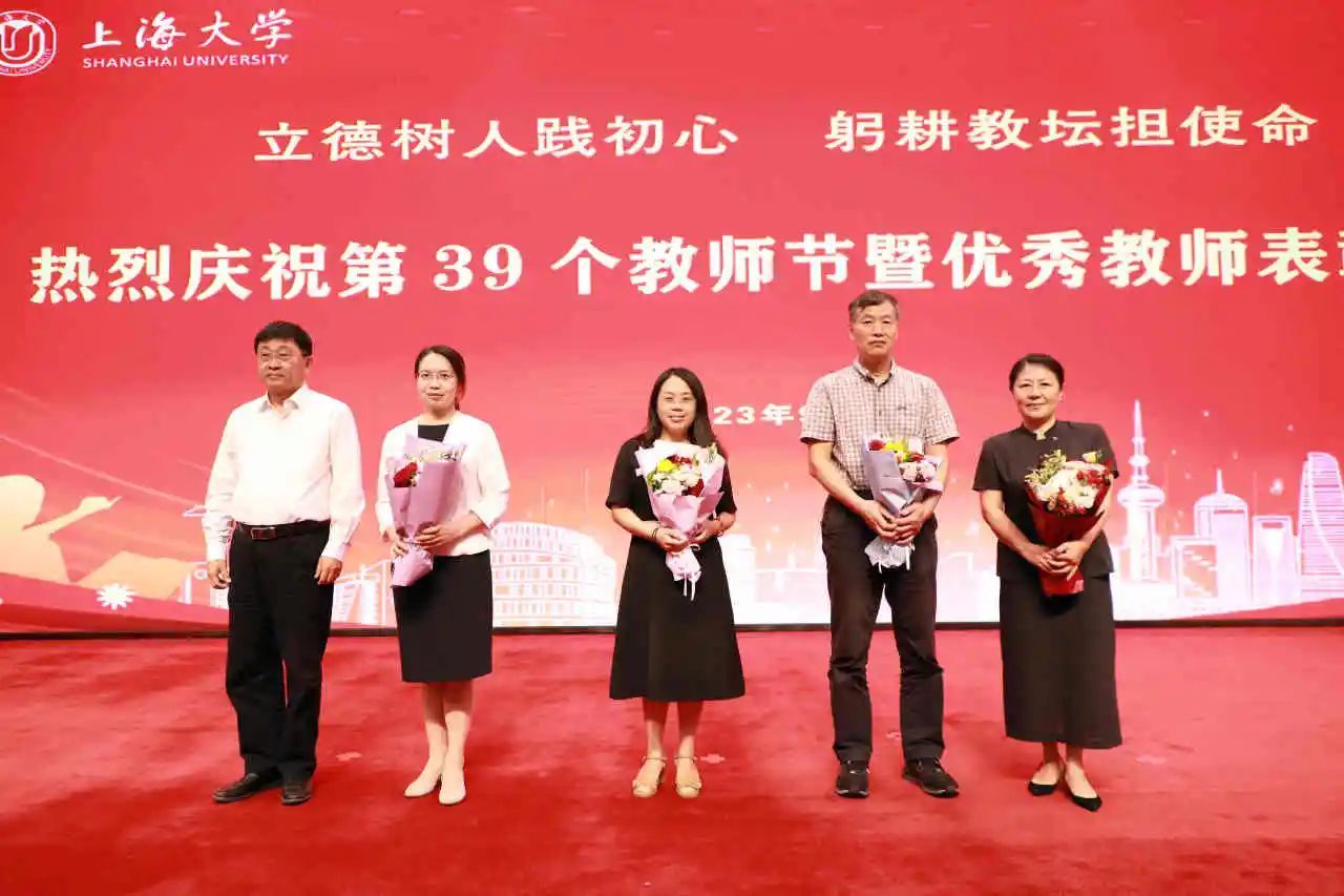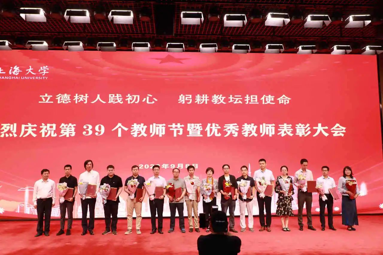 新进教师代表为从教三十年教师代表献花,学习他们矢志不渝为教育事业殚精竭虑的品格。从教三十年教师代表为新进教师代表赠送校徽,鼓励他们传承上大自强不息的精神,爱岗敬业、潜心育人。