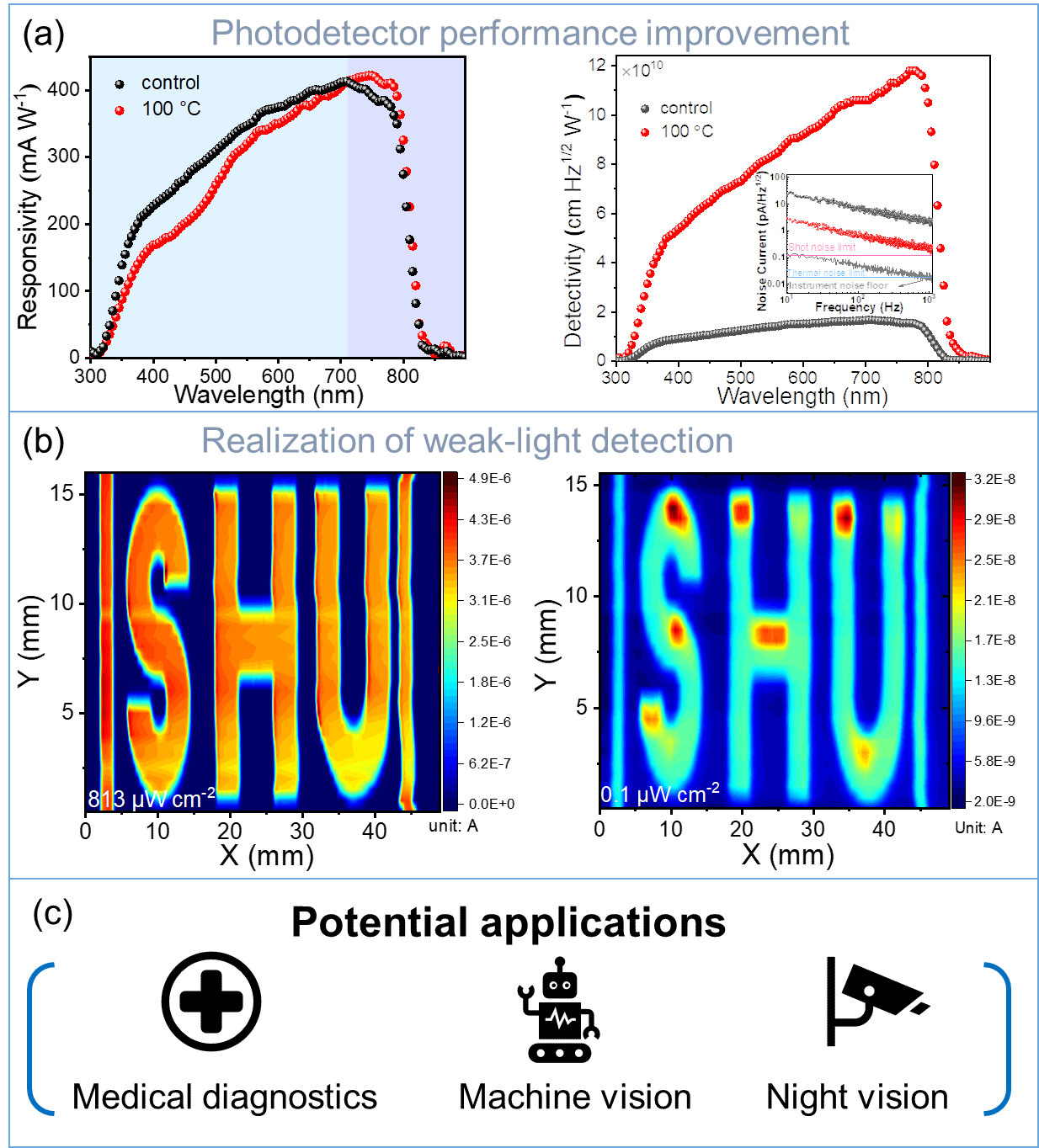 在本研究中,研究人员通过热调控衬底工艺有效抑制了二维钙钛矿薄膜中低n相的形成并促进高n相的生长,从而大幅提升了结晶质量,并减少了材料内部的缺陷(见图1),延长了载流子寿命。与此同时,材料的近红外吸收能力也得到了显著增强,吸收边界延伸至816nm。基于这一优化工艺制备的光电探测器在800nm近红外探测表现出优异性能,响应度高达0.325 A/W,探测率达到1.12 × 10¹¹ Jones,噪声电流极低,表现出良好的灵敏度与稳定性。更重要的是,该探测器在弱光(0.1 μW/cm²)照射下仍能获取清晰的高分辨率近红外成像,在弱光医疗诊断、机器视觉、夜视监控等场景有巨大应用潜力(见图2)。