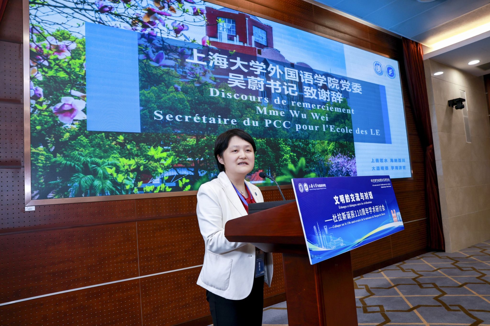 分论坛结束后,法语系主任王文新教授主持专家评议及大会闭幕式。首先,户思社教授对研讨会成果进行了总点评,着重强调了杜拉斯研究所具有的代表性意义,指出这位伟大的法国女性其生命及书写过程体现了东西方文化的碰撞与交融,其著作及相关研究不仅将促进中法文学与人文研究,更将继续有利于世界不同文明间的对话,有助于对世界局部文化冲突的反思及寻找和解方案。随后,尚新院长宣布了论文交流获奖名单,并与户思社教授、吴蔚书记一起为获奖老师颁奖,获奖者有幸获赠户思社教授的新著《淤泥与纯洁:寻找杜拉斯》,外国语学院向全体与会专家学者赠送黄荭教授的新著《我们仍在谈论杜拉斯》,两部专著由中信出版集团出版,皆为目前杜拉斯与法国文学研究的抗鼎之作。