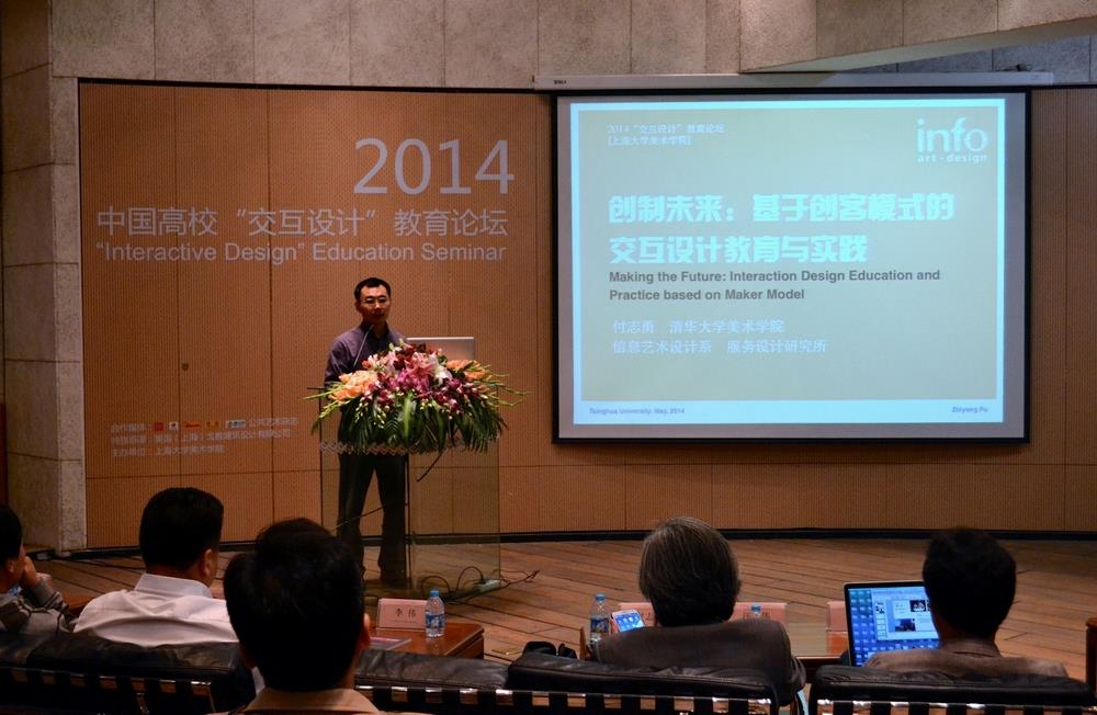 本次论坛总共分为三个主题:数字交互设计实验教学探索、数字交互技术前沿展望和数字交互设计教育未来走向。在数字交互设计实验教学探索主题中,来自全国各地的院校教师代表分享、介绍优秀和各具特色的交互教学案例和教学方法,通过对教学成果的评估,从而探索交互设计的教学模式。来自清华美院的付志勇老师首先给我们带来了《创制未来:基于创客模式的交互设计教育与实践》的主题发言,提出将创客模式引入交互设计教育中。而来自南京艺术学院的王文聪老师的发言题目《艺术化背景下的交互设计教学探索》,从一个传统的艺术院校的角度来看交互设计的教学,对广大其他的传统艺术院校来说十分具有借鉴意义。上大美院虚拟实验室主任李谦升老师的发言《文理科交融下的数字教学》,将上大美院创新的交互教学机制介绍给了其他院校的相关同行。另外,中央美院的曹田泉老师、广州美院的安娃老师、北京交通大学的王征老师等都带来非常精彩的发言。